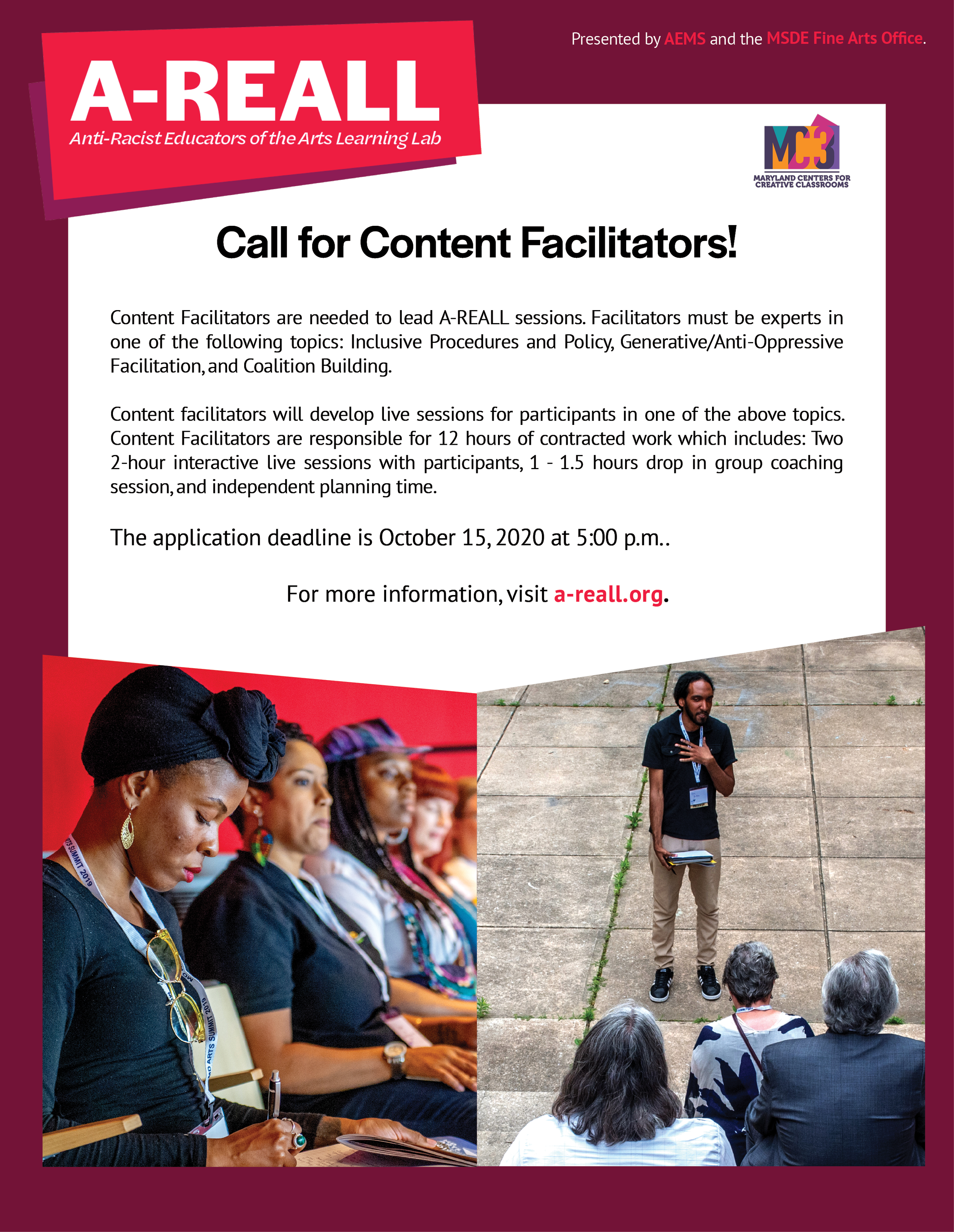 AEMS and MSDE is seeking a content facilitator to walk a cohort of arts educators through an anti-racist journey. Facilitators must be experts in (1) of the following topics: